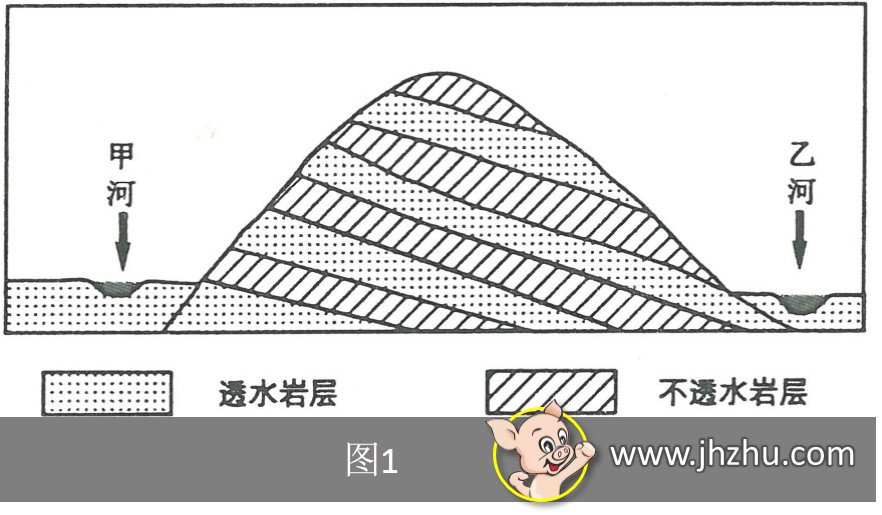 图1所示山地为甲、乙两条河流的分水岭,由透水和不透水岩层相间构成。在生态文明建设过程中,该山地被破坏的森林植被得以恢复,随之河流径流量发生了变化,河流径流的年内波动也减缓了。据此完成7-9题。