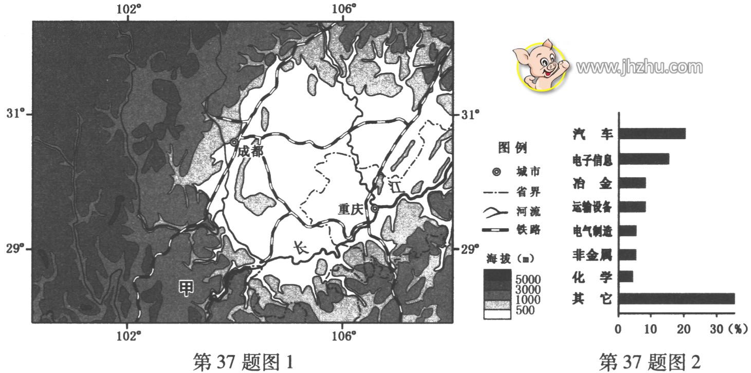 材料一 图1为我国西南部分地区略图。图2 为2014年重庆工业结构图。